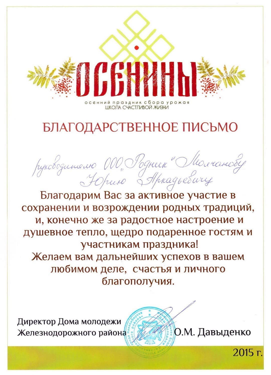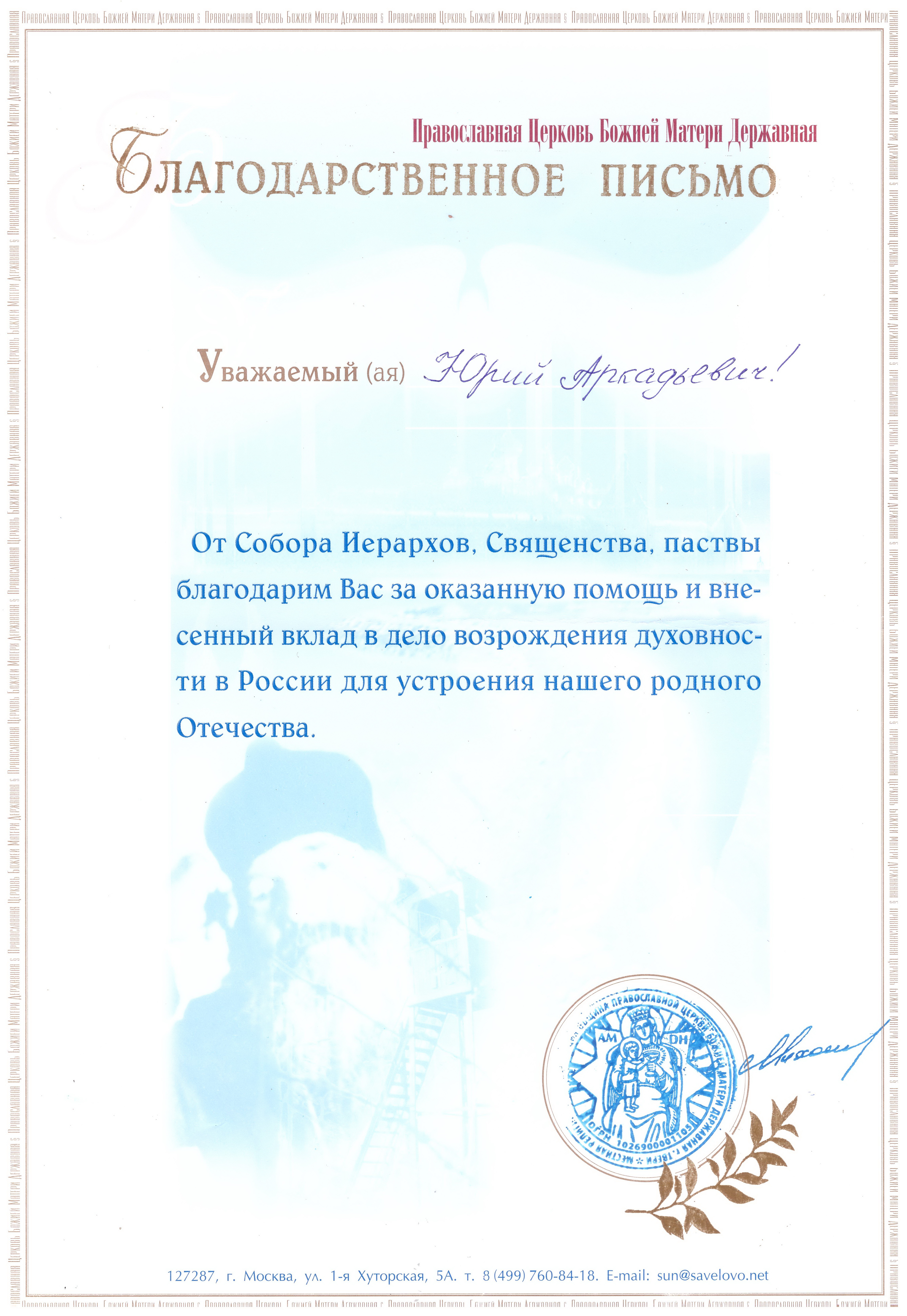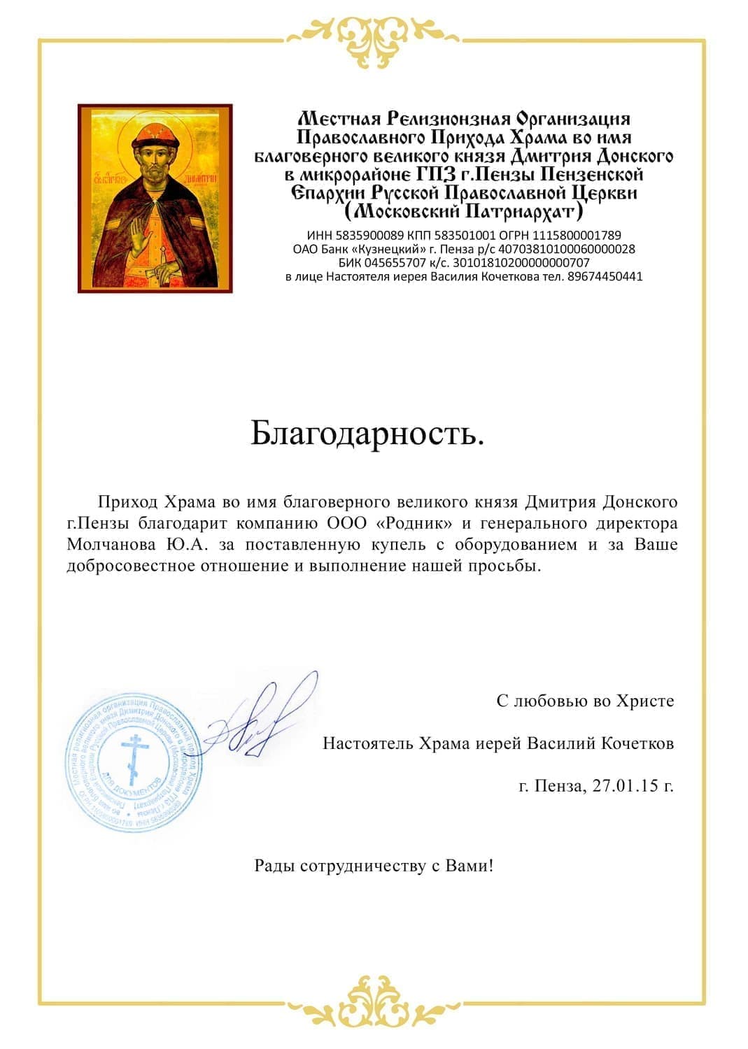 Благодарственное письмо от Храма Дмитрия Донского г. Пенза